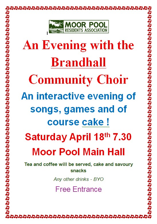 Free Entry with Tea Coffee Cake and Snacks. Bring your own drinks. Come and enjoy songs games and cake. Moor Pool Main Hall.