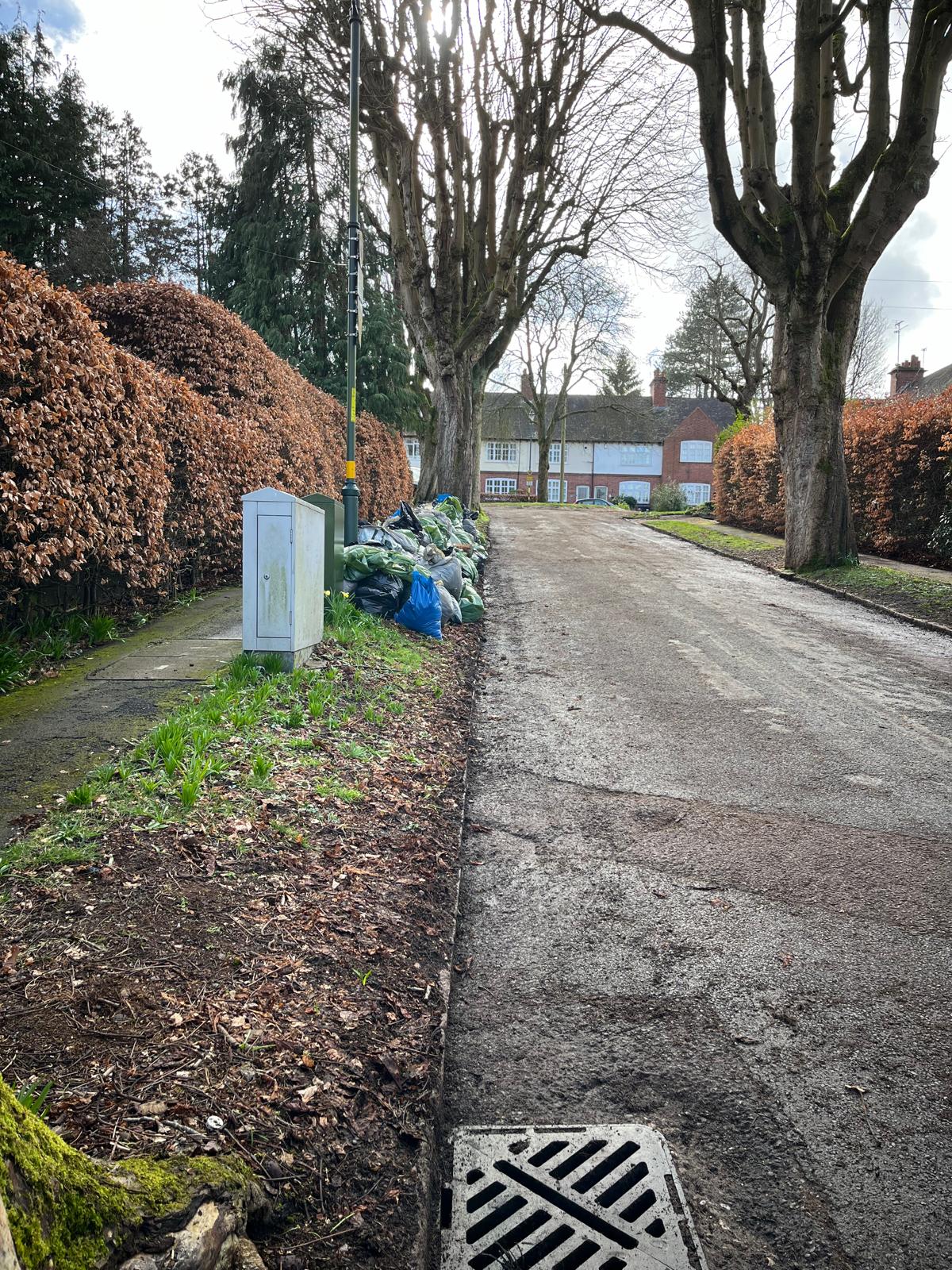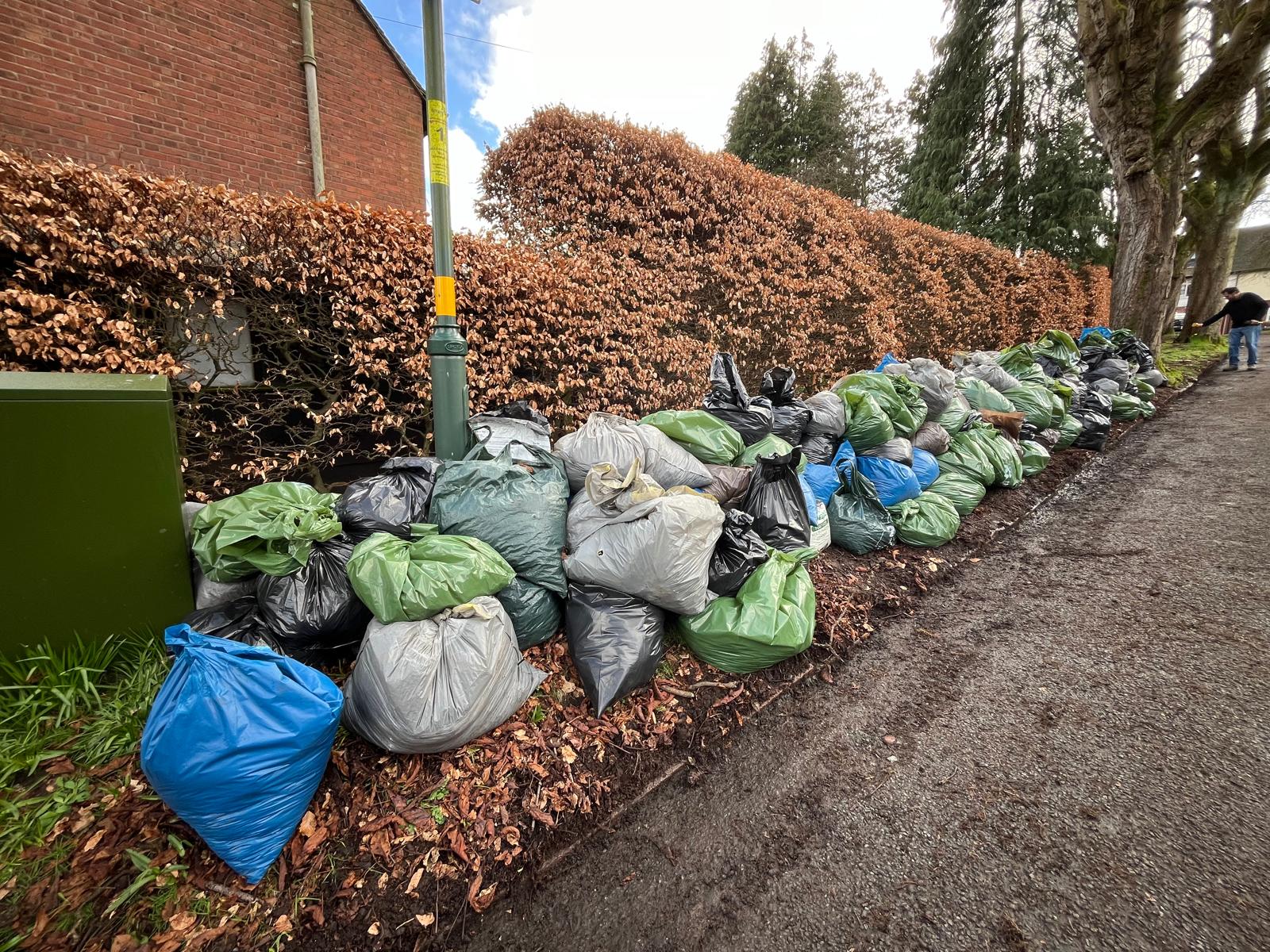 pile of bagged up leaves ready on the verge for collection.